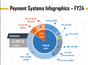 The landscape of retail payments in Pakistan has experienced a dramatic transformation over recent years. Historically dominated by cash, the payment ecosystem is witnessing a sizeable shift towards digital transactions. Data from the State Bank of Pakistan indicates that while cash payments once constituted the bulk of transactions, digital payments have surged dramatically over the past 15 years. The coronavirus (COVID-19) pandemic shifted consumer behaviour and further accelerated mobile and cashless banking adoption. This rapid digital uptake fueled by wallet transactions and mobile banking app-based transactions. ATM-based transactions also contributed to this growth, reflecting a broader trend towards digitalization in the retail payments space. According to SBP’s FY24 Payment Systems Review, digital payments now constitute 84% of all retail transactions, up from 76% in FY23.
